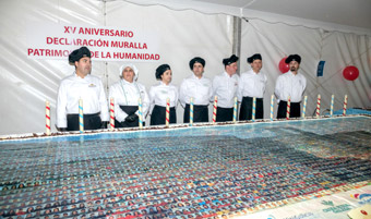 Confiteros de la Asociación de Pasteleros de Lugo, entre ellos ConfiterÃa MartÃn, Mallorca, Santos, Yomar y Ramón, elaboraron una tarta gigante para conmemorar el 15º aniversario de la declaración de la Muralla como Patrimonio de la Humanidad.