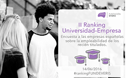 A partir dos datos de 2.155 enquisas a responsables de contratación doutras tantas empresas de toda España, o segundo ránking Universidade-Empresa cualifica a USC como a universidade española con mellor percepción entre os empregadores no ámbito das Humanidades e outras Ciencias Sociais. Este informe da fundación everis sobre empregabilidade de recén titulados/as sinala que a USC é a mellor valorada en canto a honestidade e compromiso ético, habilidades interpersoais e a comunicación, capacidade de análise e resolución de problemas, a orientación a resultados asà como os coñecementos técnicos que achega aos seus titulados/as para o exercicio da profesión.