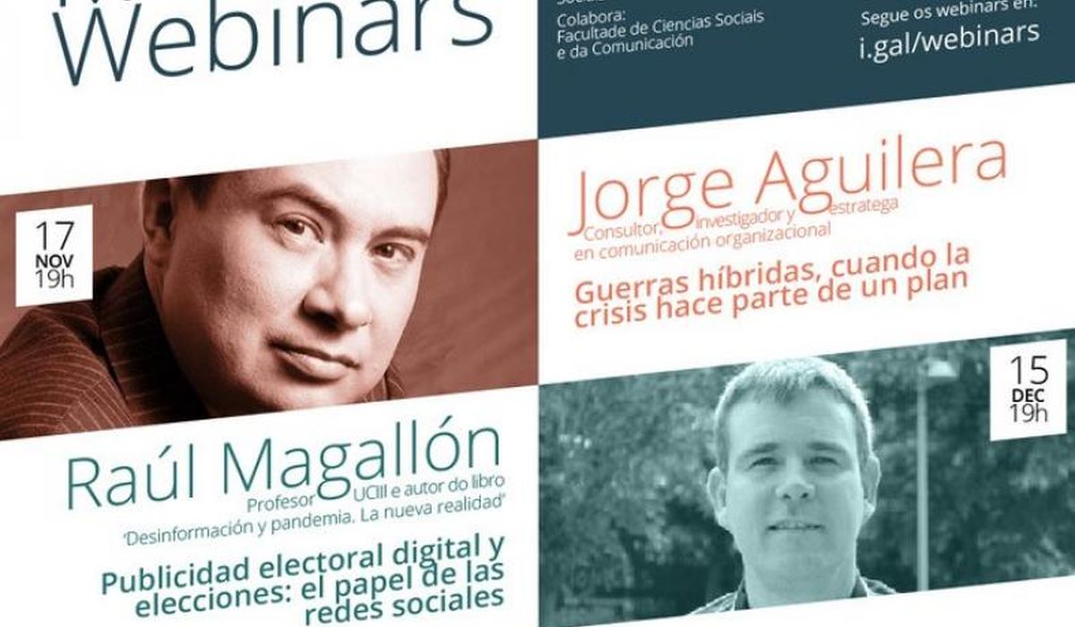 Os Social Media Webinars arrancan o vindeiro martes 17 coa conferencia Guerras hÃbridas, cuando la crisis hace parte de un plan, a cargo do consultor, investigador e estratego en comunicación organizacional Jorge Aguilera, que, nun coloquio moderado pola profesora Ana Belén Fernández Souto, porá o foco na xestión comunicativa de crises a través do estudo de casos prácticos a nivel nacional e internacional. O 15 de decembro, o papel das redes sociais na publicidade de carácter polÃtico será analizada nun relatorio moderado polo profesor Alberto Dafonte e impartido por Raúl Magallón, profesor da Universidad Carlos III de Madrid e autor do libro Desinformación y pandemia. La nueva realidade.