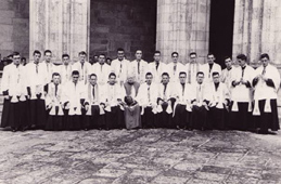 Grupo de 25 sacerdotes ordenados na Igrexa de Santiago-a Nova-de Lugo o 22 de marzo do 1958 e o da súa primeira Misa, na catedral, o dÃa 24. (Na foto, con D. Francisco Vázquez Saco, rector do Seminario, no claustro da catedral).