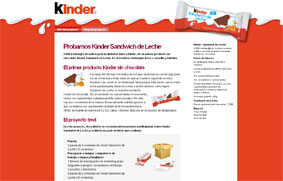 Después de comercializar Kinder Sandwich de leche en Levante y Andalucía, como zonas experimentales durante más de 10 años, el fresco y saludable tentempié se lanzó en Septiembre de 2007 a nivel nacional con un spot de TV protagonizado por Sara Baras, bailaora que representa la naturalidad y frescura de la marca. Ahora, Kinder ha decidido reformar su plan de comunicación 360 grados e incluir una campaña de boca a boca, con la ayuda de trnd y sus miembros gallegos. Juntos, darán a conocer la primera experiencia en España, de producción y comercialización de una merienda sana, fresca y nutritiva, fuente de vitamina B12, B2, calcio, y fósforo, hecha con 40 % de leche pasteurizada, miel y bizcocho.