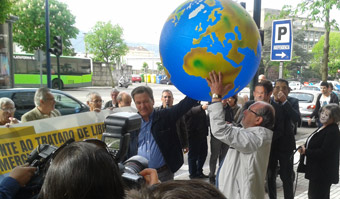 O BNG elixiu a sede do consulado alemán en Vigo para un acto de protesta contra o Tratado de Libre Comercio e Investimentos UE-EEUU (TTIP) que contou coa presenza figurada da chanceler Angela Merkel, do presidente norteamericano, Barack Obama, como máximos representantes dos poderes que impulsan este tratado, e con Mariano Rajoy, como extra convidado nunha negociación de costas á cidadanía.