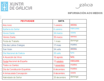 En total, precisou, son doce dÃas que inclúen a axenda de festivos estatais e autonómicos de 2016, aos que se sumarán dous festivos locais que deciden os concellos.