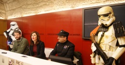 A concelleira de Turismo, Marta Lois, acompañada dos representantes da Tropa Korriban, Manuel Ángel Gayoso e Andrés Torreiro, presentaron no Pazo de Raxoi o desfile que terá lugar polas rúas de Santiago e que rematará na praza do Obradoiro o 27 de maio.