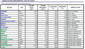 En el que se refiere a las cuencas destinadas al consumo hidroeléctrico, el embalse de Vilasenín es el único que está al 100% de su ocupación. En la tabla, se señalan los datos del estado actual de los embalses de abastecimiento (azul) y de uso hidroeléctrico (verde).