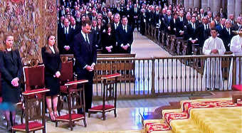 Diez minutos antes de las 19.00 horas los Príncipes de Asturias, don Felipe y doña Letizia, fueron recibidos en la entrada de la Catedral compostelana por el arzobispo de Santiago, Julián Barrio; el presidente del Gobierno, Mariano Rajoy; su mujer, Elvira Rodríguez; y el máximo mandatario gallego, Alberto Núñez Feijóo.