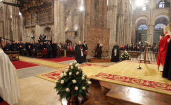 El acto, presidido por el arzobispo de Santiago, Julián Barrio, ha dado comienzo poco después de las 11.30 horas, cuando las autoridades eclesiásticas han entrado a la Catedral por la puerta de Azabachería al mismo tiempo que desde el Pazo de Raxoi se iniciaba la comitiva de autoridades civiles. Durante la Eucaristía, le delegada regia ha sido la encargada de realizar la ofrenda al Apóstol, al que ha pedido su intercesión para hacer "sostenible el sistema de bienestar" y luchar contra el desempleo.
