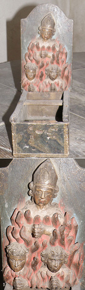 Esta imaxe é ben insólita e estimulante para o reclamo de librarse do xuízo final, exhibindo a un prelado na fogueira eterna. Unha icona desta categoría non se repite nesas caixas, ou cepillos, que cada igrexa ten. Estamos a falar dunha peza sinxela, moi ben concibida e lograda por un escultor anónimo, quizais do entorno rural ribeirao e, mais que de conceptos estéticos percibía a psicoloxía dos labregos e buscou a imaxe certa para impactalos.