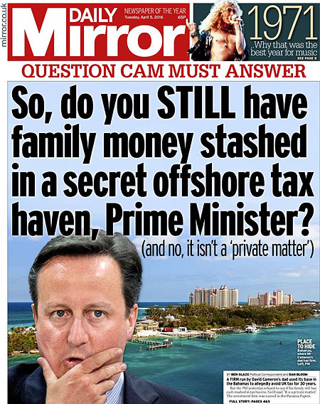 A los medios no les convenció la respuesta de Cameron en su primera intervención pública tras el estallido del escándalo y casi todos llevaron a sus portadas la manera en la que eludió la cuestión. Entre los más elocuentes, el Daily Mirror, que trasladó la pregunta a su portada: «Entonces, ¿usted TODAVÍA tiene dinero familiar guardado en un paraíso fiscal secreto? (y no, no es un asunto privado)» [So, do you STILL have family money stashed in a secret offshore tax haven, Prime Minister? (and no, it isnt a private matter)].