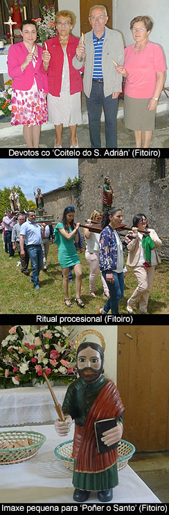 En canto ao coitelo do San Adrián, noutrora houbo persoas relacionadas coa Casa do Rego como Manuel Blanco Lozano, Rosendo Rego Rego, Xosé María Rei Rego, e Xosé Antonio Blanco Teixeiro, que aparte de facer os coitelos, logo pasabanos pola imaxe do San Adrián e dábanllos aos devotos, quenes cumprían co ritual ao igoal que en Fitoiro (Bretoña) (4). Hoxe, xa os propios devotos tocan a imaxe cos coitelos e, logo, pasanos polas partes doentes cunha finalidade sandadora. Hai devotos que seguen co ritual nas suas casas e tamén os hai que realizan o seu propio coitelo de madeira e ben dun xeito directo ou indirecto bendiceno ou mandano bendicir -se eles non poden- para poder facer o ritual. Foi o caso de José Grandío da parroquia vilalbesa de Martiñán que no ano 2016 veu cun coitelo de madeira moi personalizado, pasouno polo pescozo da imaxe; logo, pola pía de auga bendita; e finalmente entregoullo á persoa, que lle delegara o ritual.