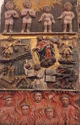 A primeira escena, comezando pola parte inferior, observamos as vermellas lapas do purgatorio, tan activas como destrutivas, na que se atopan tres mulleres en actitude pensante, e a cada lado dous varóns de rango eclesiástico, pola tonsura que circunda a súa cabeza, e o outro pola barba esclarecida, os dous en postura observante. O purgatorio, como preludio de sanear as transgresións do malfeitores, ofrece un aviso previo a estar en concordancia coa regra e cos matices doutrinarios. Unha maneira simple de catequeses simplificado na imaxe. Unha imaxe naturalista e tráxica que aos crentes medievais atormentaba. Aos observadores actuais interésalles mais o formato e o diálogo que podemos establecer co creador de arte. Ese pensador que desde o lado eclesiástico conformou unha estética con relevantes valores creativos. Iso é o que nos achega a eses recatos dunha idea universal que fai séculos tiña unha inclusión de ameaza destrutiva, mais o estilo artístico impón a súa mesura. O purgatorio co seu lume purificador marca un onte e un hoxe, nese dualismo cada vez menos entendido.