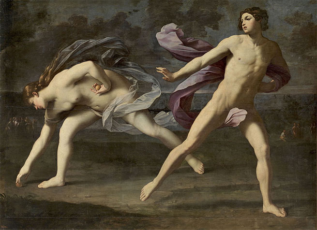 Tras las noticias sobre la distribución de las bombas nucleares por Europa, corrí hacia el Museo del Prado a contemplar el Hipómenes y Atalanta en la exposición de Guido Reni, recordando la primera vez que lo viera en las iluminadas penumbras de los depósitos del ático con las contraventanas entornadas para evitar la luz directa sobre las pinturas , evocando aquella visión en las sombras luminosas de aquella estancia en que se guardaba, la sensación de contemplar una veloz carrera detenida, congelada y ordenada mediante la geometría de las líneas y la contención de los colores fríos. el prodigioso arte de aquietar el desasosiego por medio de un orden ideal.