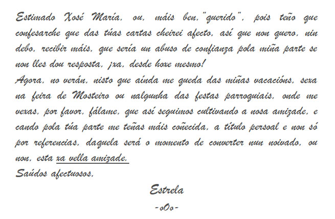 Estou saturado de traballos..., de traballo e de traballos, pero o de escribirlle semanalmente á Musa na que puxen os meus ollos isto non é traballo senón goce, descanso, reposición de forzas. Teño que facer milagres, co meu corpo pero tamén co meu espírito, para alzarme, sequera un pouco, da miña condición plebea; ¡teño que facerme digno do meu sino, da miña Estrela!